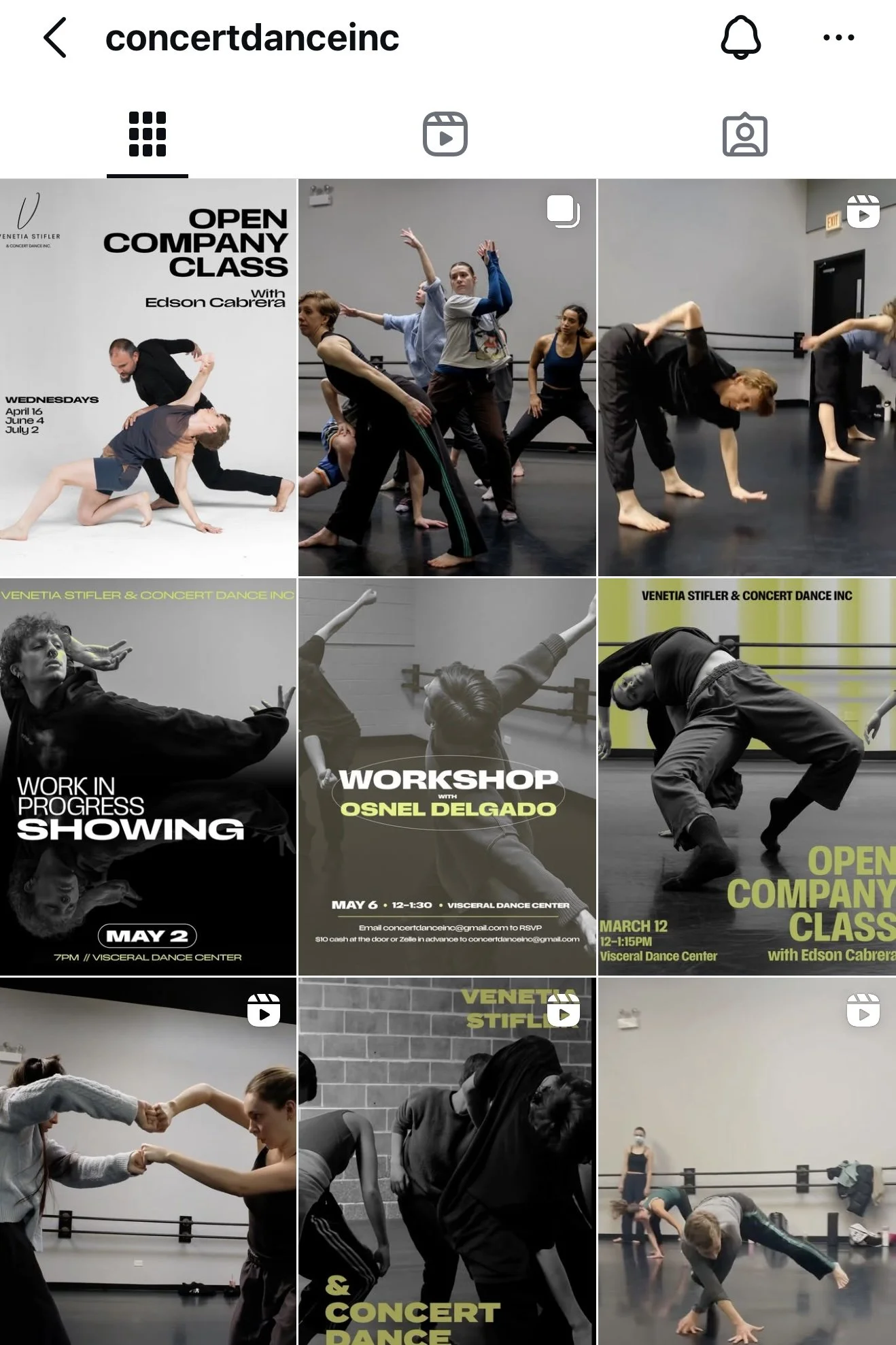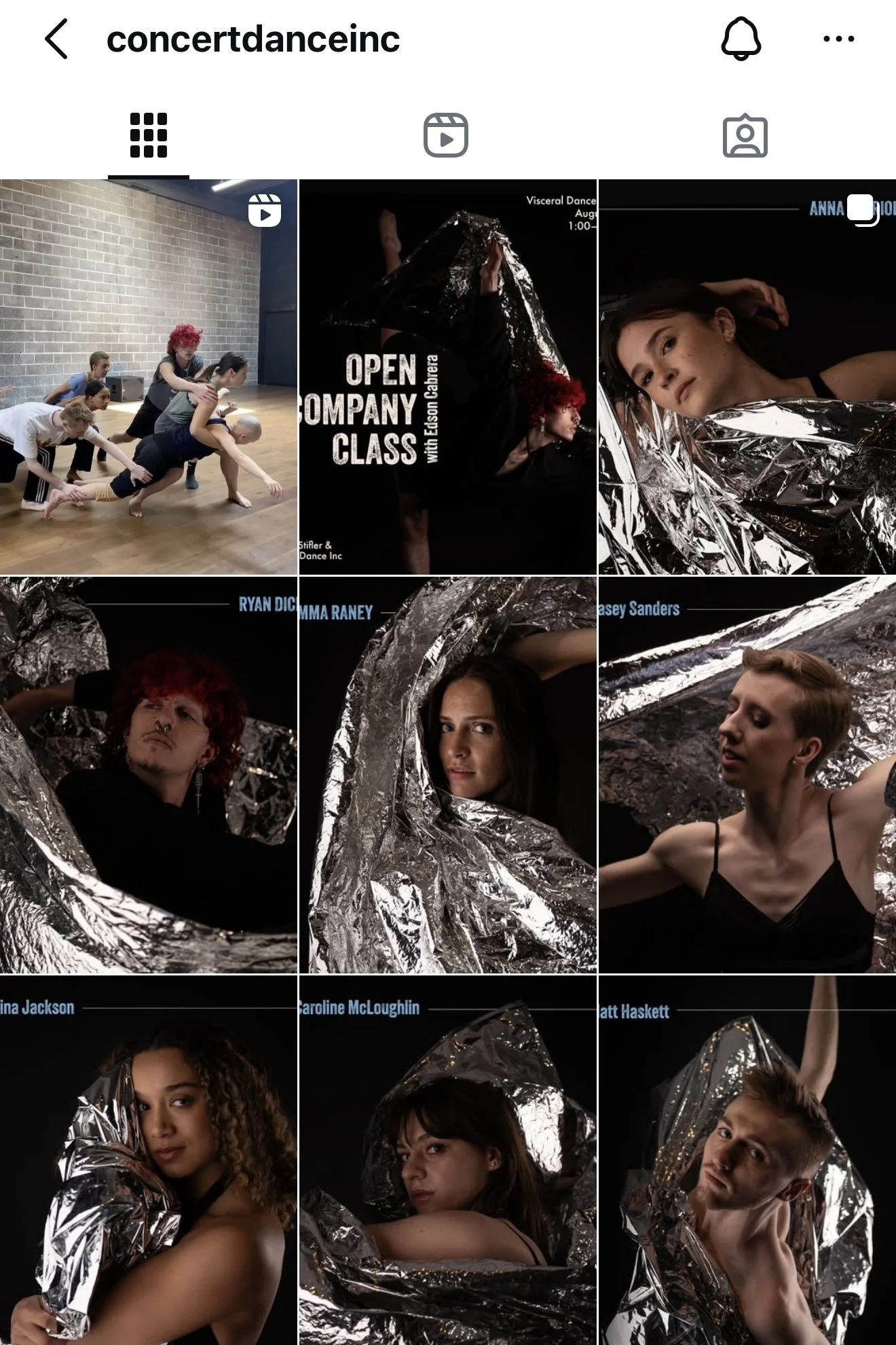 Since 2023, I have served as the social media coordinator and resident graphic designer for contemporary dance company, Concert Dance Inc (CDI). My role has been primarily to design social media graphics, posters, performance programs, as well as film and edit videos. I oversee I also plan and schedule content with marketing strategies in mind, in coordination with upcoming events and concerts. In rehearsal I take photographs and video movement for content.